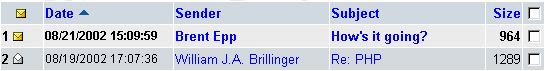 第一欄表示該封郵件的狀態,金色且封口的信封表示該郵件尚未被讀取,同時該列中的所有文字也應該會是粗體。圖中的第二列是白色且開口的信封表示該郵件已經被讀取過了,同時該列中的所有文字也應該會是一般字體 (不是粗體)。點選你想要改變讀取狀態的郵件信封,你可以改變該封郵件的狀態。假如是已經被讀取過的,它會變成未讀取的狀態。